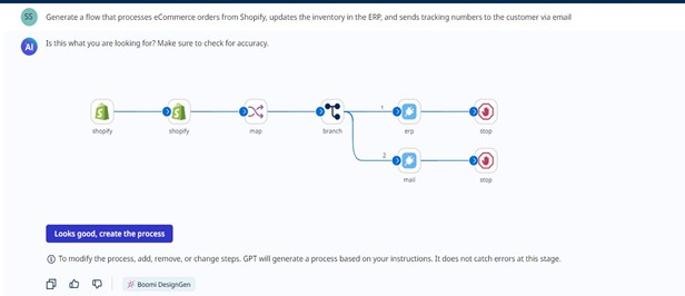 Notification: After fulfillment, Boomi AI creates a flow for automated customer notification via email, with real-time updates.